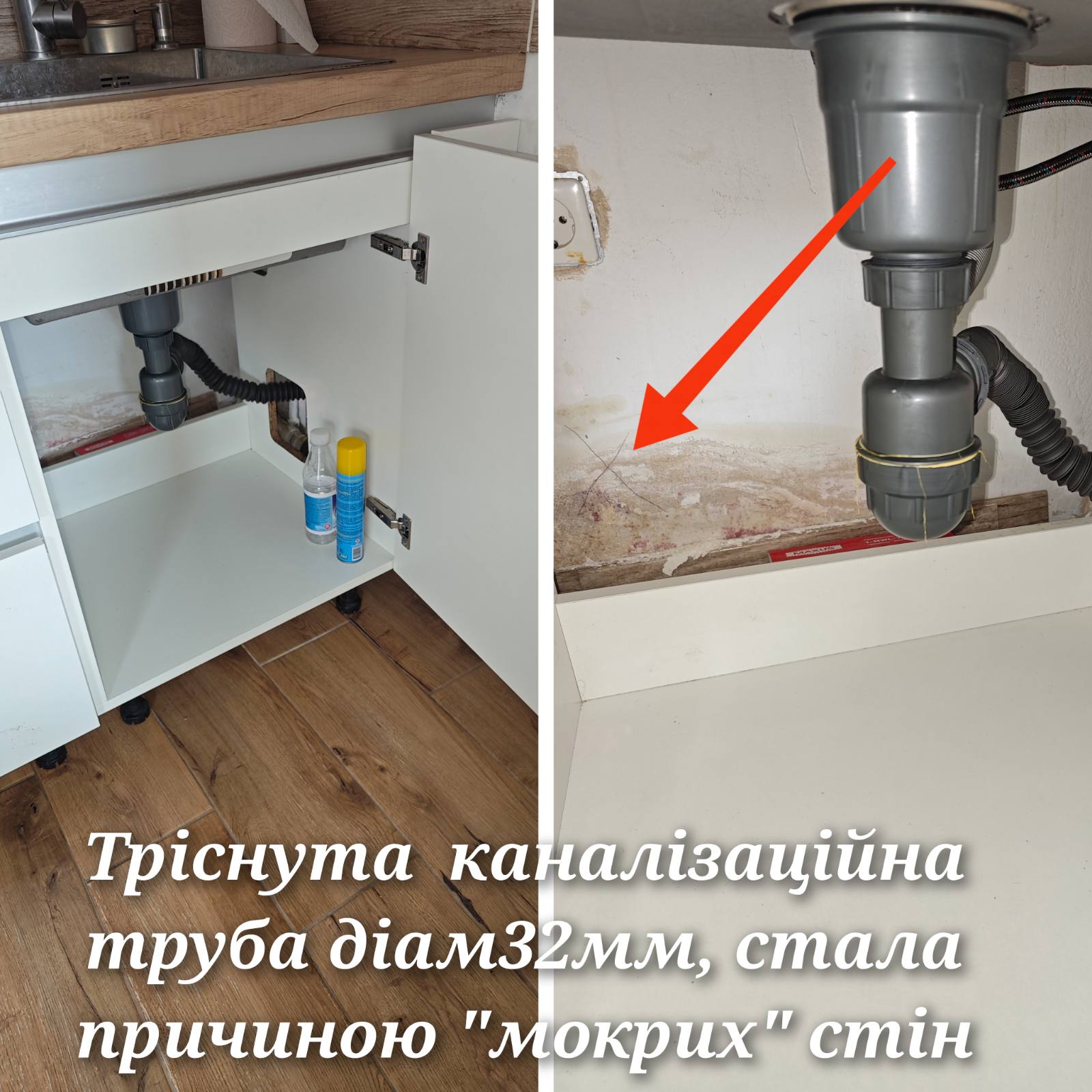 Стіна в кухні мокріла через тріснуту каналізаційну трубу від пралки, діаметром 32 мм.