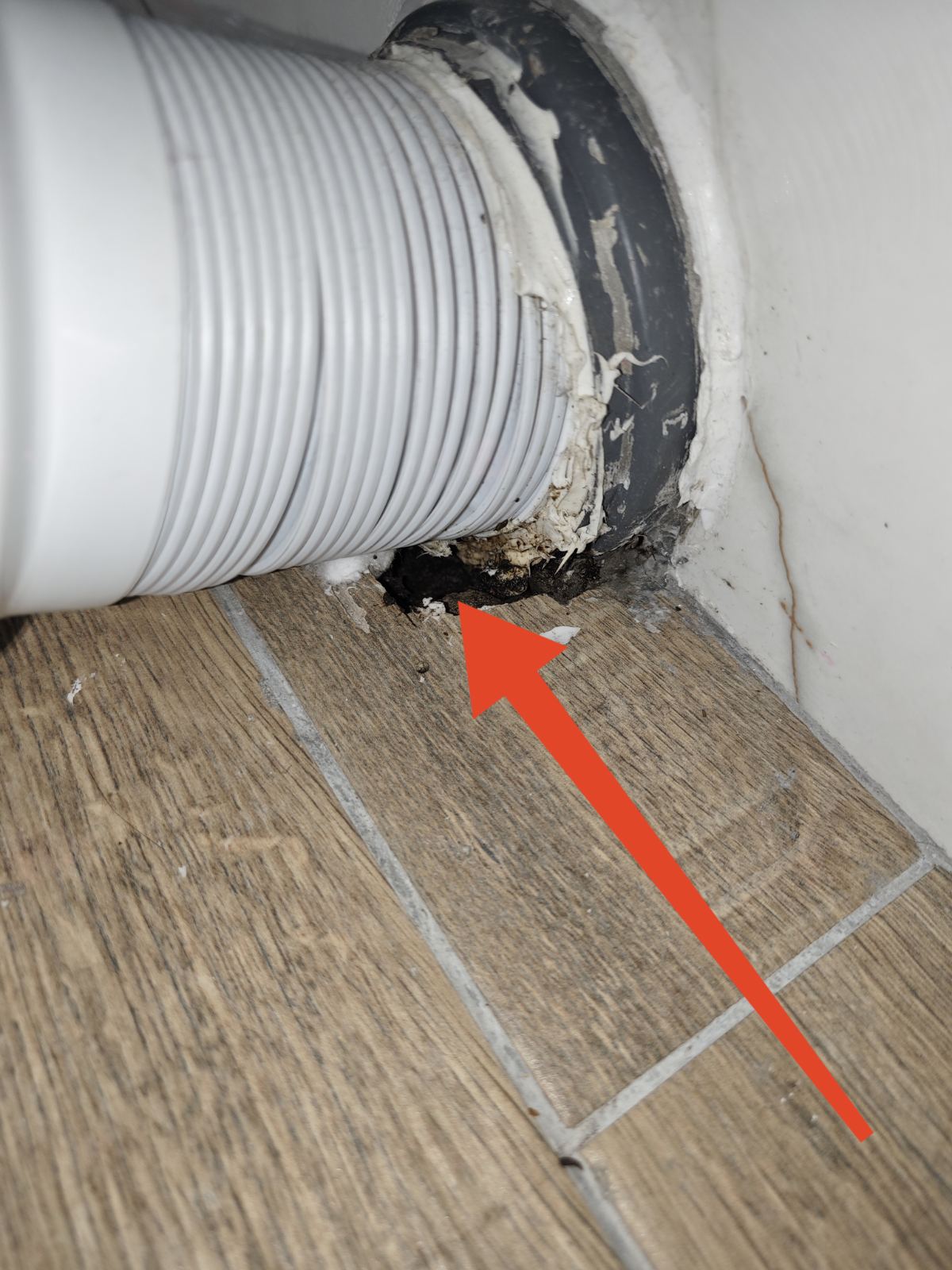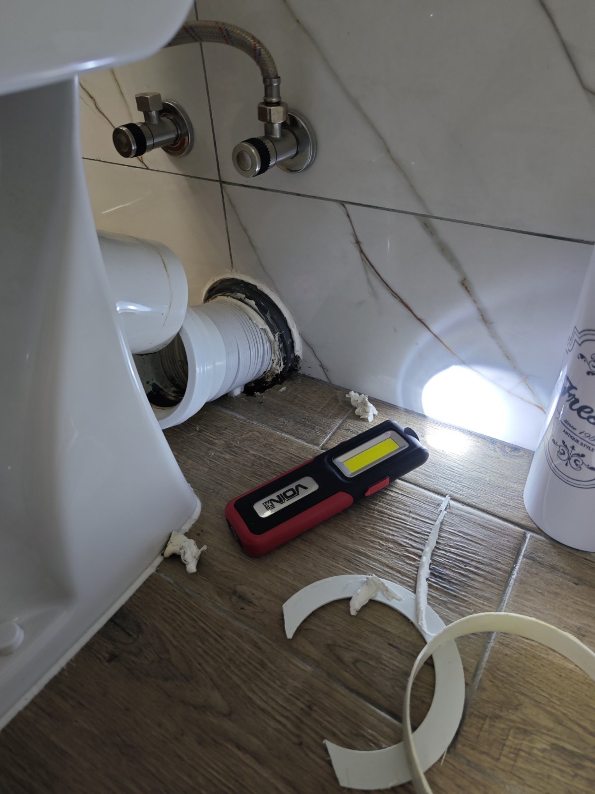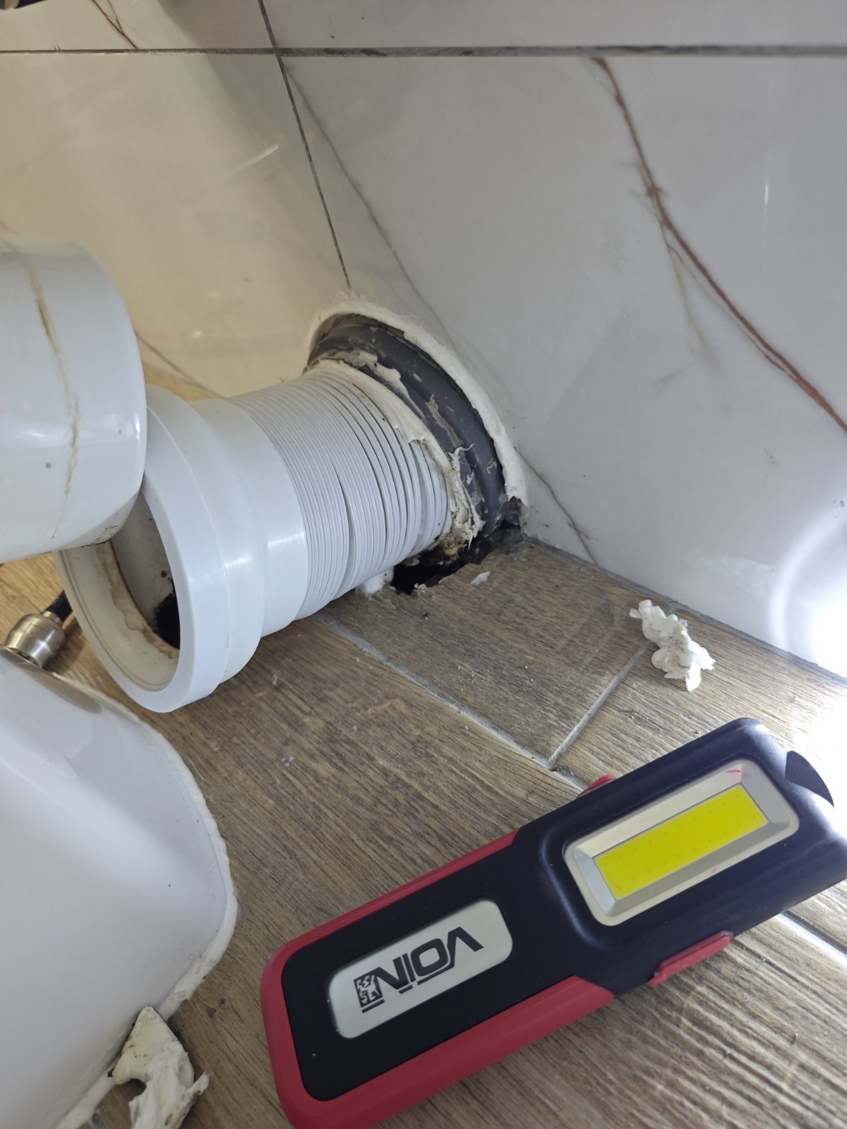 Але, як видно , через брак місця її криво поставили, і стічна вода просочується в стяжку, яка під гофрою вся мокра.